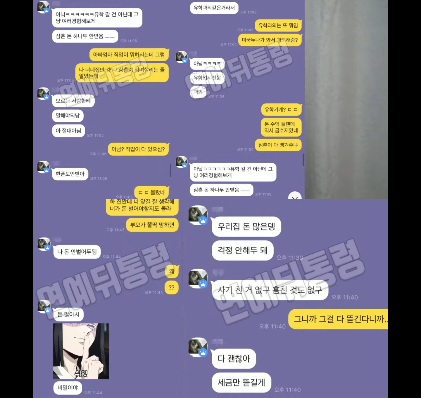 "나 너네 집안은 삼촌이 다 먹여살리는 줄 알았는데"라는 말에 대해선 "모르는 사람한테 말해야되나. 아 절대 아님. 한 푼도 안받아"라고 강조했다. 이후 "부모님이 뭐하시는 분인지. 부모가 망하면 네가 돈 벌어야 할지도 모른다"라는 A 씨 이야기에, 조카는 "사업이라고 할게. 나는 돈 많아 안 벌어도 된다. 쉿 비밀이야. 우리 집 돈 많아 걱정 안해도된다. 사기친 것도 없고 훔친것도 없다. 세금만 뜯길 것"이라고 답했다.