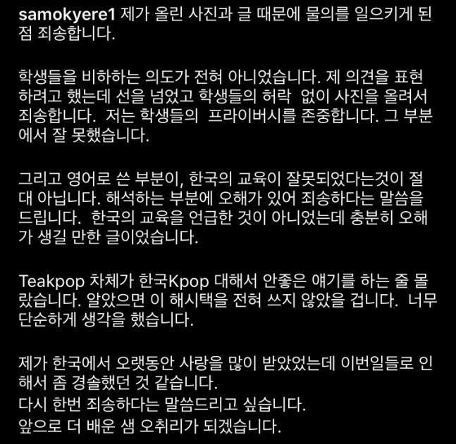 그런데 학생들의 얼굴을 공개해 저격하고, 뜬금없이 다소 부정적 어조로 쓰이는 'teakpop(K팝 뒷이야기)'이라는 단어를 해시태그로 붙여 한국을 비하했다는 시선 등이 더해지며 논란이 일었다. 아울러 그가 과거 JTBC '비정상회담'에서 눈을 찢는 포즈를 선보인 것이 재조명되며 동양인을 비하했다는 내로남불 역풍에 휘말려 비난은 더욱 거셌다.