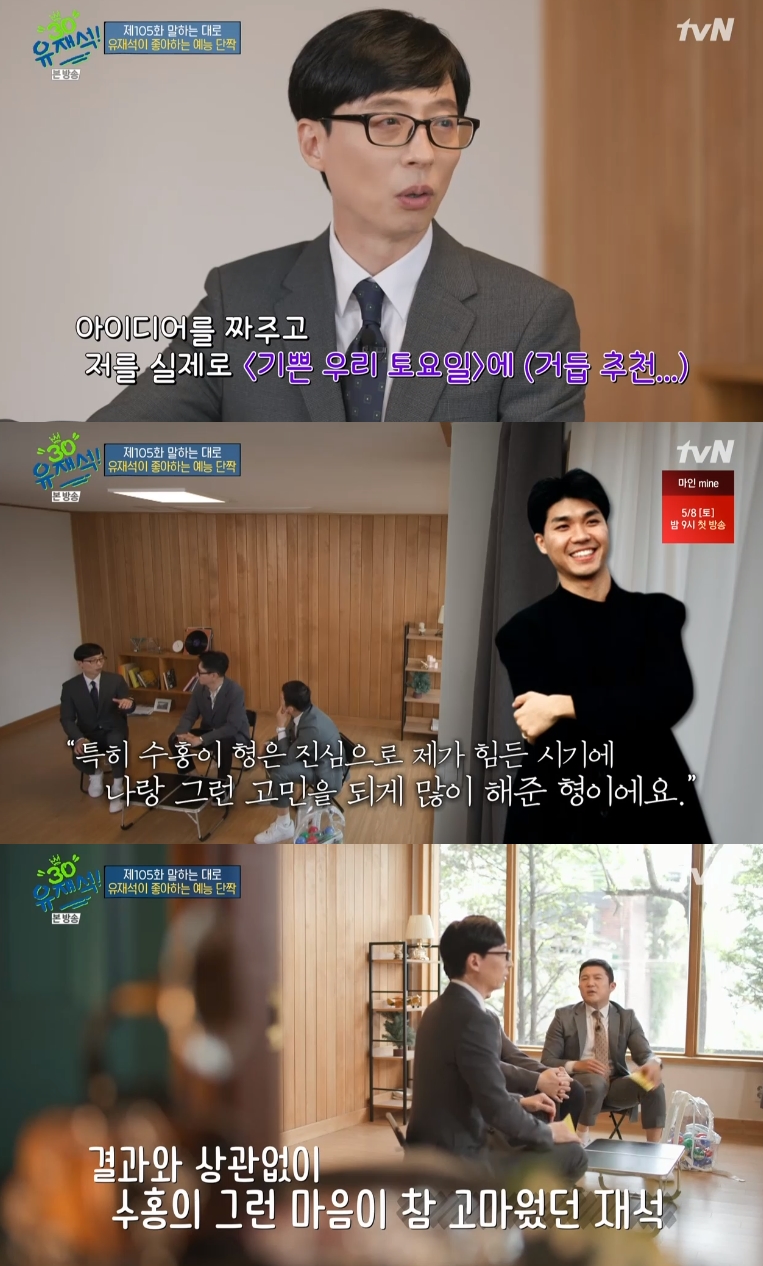 유재석은 무명 시절을 떠올리며 "특히 수홍이 형은 제가 힘든 시기, 진심으로 저의 고민을 많이 해 준 형"이라면서 "SBS '기쁜 우리 토요일'에 저를 꽂아주려고 했다. '네가 잘 될 것 같다'라고 하더라"라고 밝혔다. 또 "아이디어를 함께 짜줬고 실제로 어떻게든 출연시키게 해주려고 노력했다"고 덧붙였다.