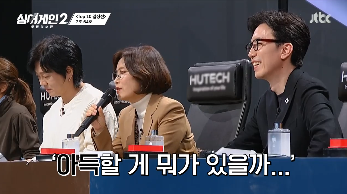 이날 무대에서 64호는 원로가수 최백호의 '길 위에서'를 진정성 충만한 목소리로 불러내 감탄을 자아냈다. 심사위원들이 흐뭇한 표정을 지은 가운데 참가자들도 "어지럽네" "진짜 잘한다"라며 감탄했다.