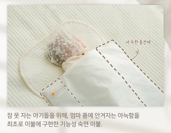 잠든 아기에게 제품을 덮어주면 엄마가 안아주듯 자연스럽게 몸을 감싸주어 쉽게 잠들지 못하는 아기의 숙면을 돕는다는 것이다.