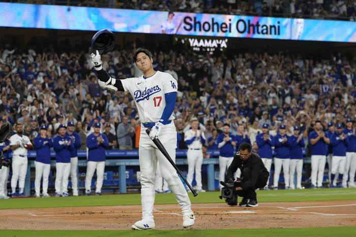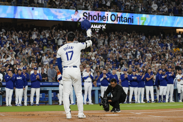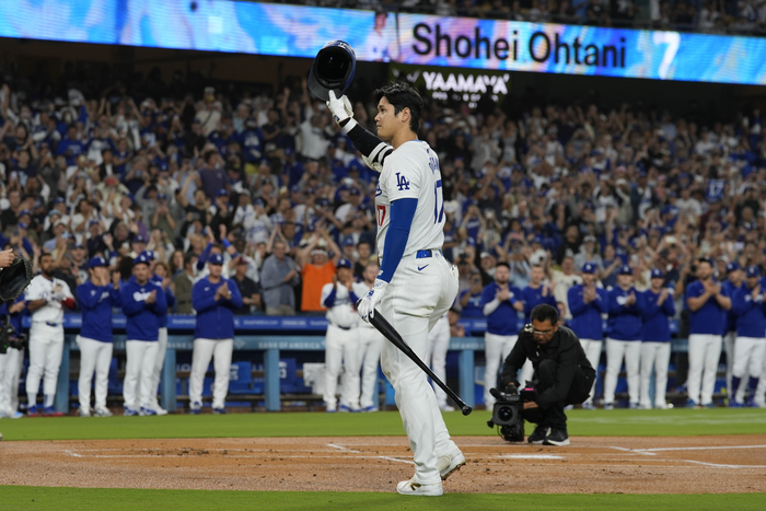 그가 1회 선두타자로 나오자 5만명에 가까운 팬들이 기립박수를 보냈다. 오타니는 머리위로 헬멧을 든 채 360도를 두어번 돌며 인사했다.