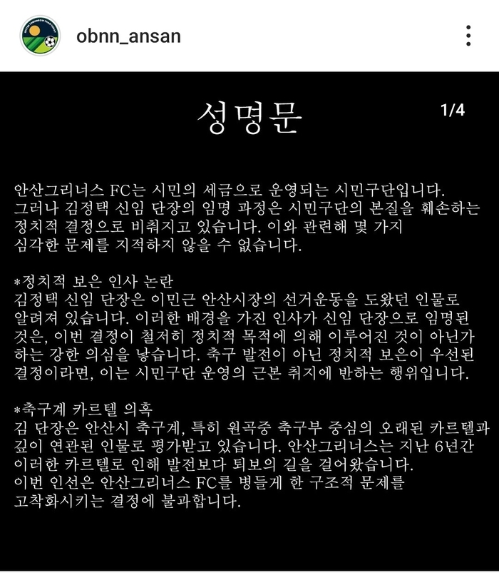 안산 지지자 연대 소모임인 ‘오늘보다 나은 내일’은 최근 공식 소셜 미디어를 통해 지난 19일 임명된 김정택 신임 단장과 관련해 ‘시민구단의 본질을 훼손하는 정치적 결정’며 ‘김 단장은 이민근 안산시장의 선거운동을 도왔던 인물려 알려져 있다. 이번 결정이 정치적 목적에 의해 이뤄진 게 아닌가 강한 의심을 낳는다. 이는 시민구단 운영의 근본 취지에 반하는 행위’라고 비판했다.