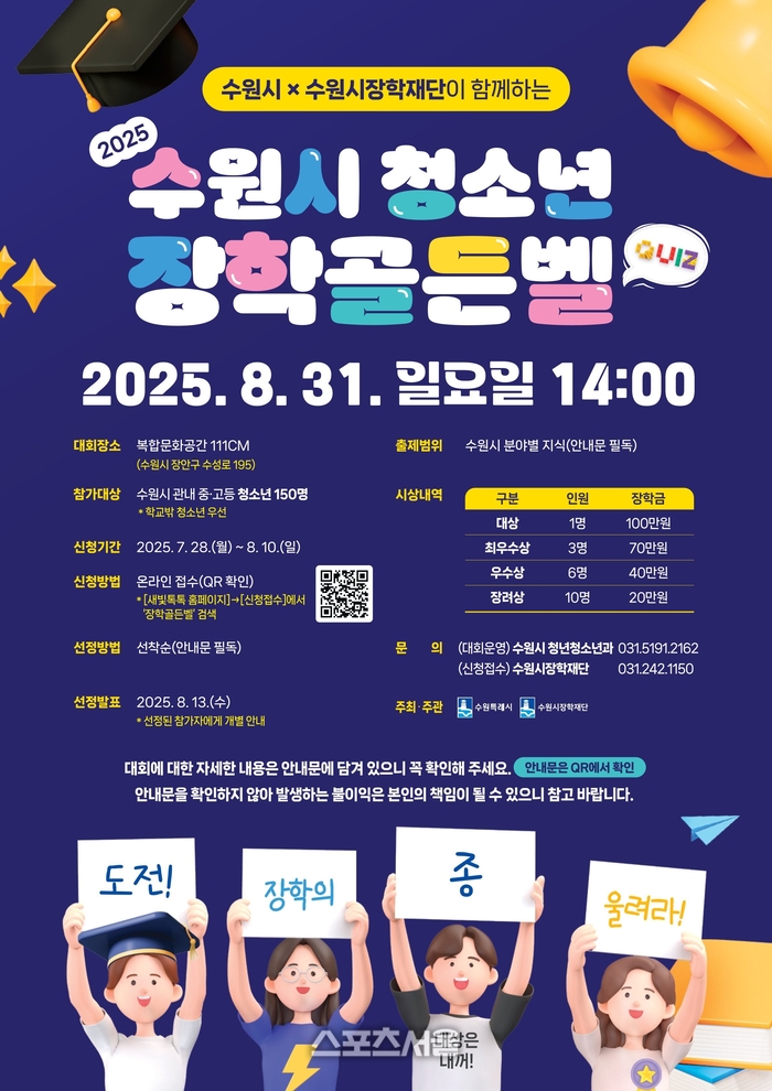〔스포츠서울│수원=좌승훈기자〕경기 수원시는 지역 이해도를 높이고, 장학 혜택도 받을 수 있는 ‘청소년 장학골든벨’에 참가할 청소년 150명을 다음 달 10일까지 모집한다고 29일 밝혔다.