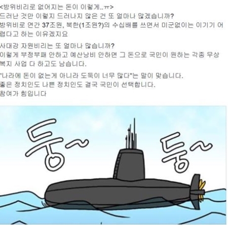 이어 '4대강 자원비리는 또 얼마나 많습니까'라며 '이렇게 부정부패 안하고 예산낭비 안하면 그 돈으로 국민이 원하는 각종 무상복지 사업 다 하고도 남습니다'라고 덧붙였다.
