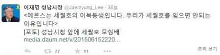 지난 6월 이 시장은 자신의 트위터를 통해 "메르스는 세월호의 이복동생이다 우리가 세월호를 잊으면 안 되는 이유"라고 말했다.