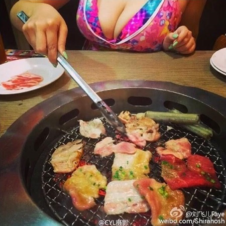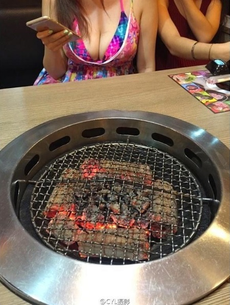 이 중국 여성은 고기를 비롯해 해산물 등을 주문해 석쇠에 구우며 본격적으로 먹을 준비를 하고 있다. 고기와 해산물들이 알맞게 익어가고 있는 가운데 눈길을 끄는 것은 다름아닌 이 중국 여성의 옷차림이다.