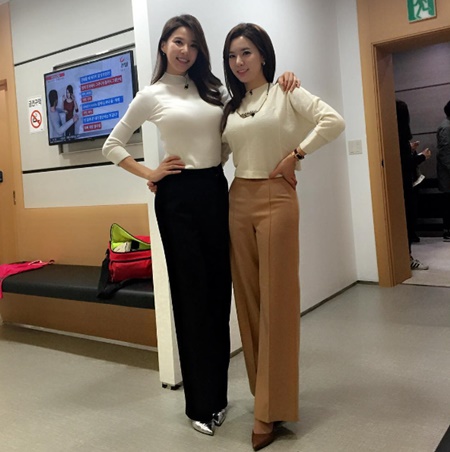 공개된 사진 속에는 대기실로 보이는 장소에서 사진을 촬영하고 있는 정지원 아나운서와 레이양의 모습이 담겼다.