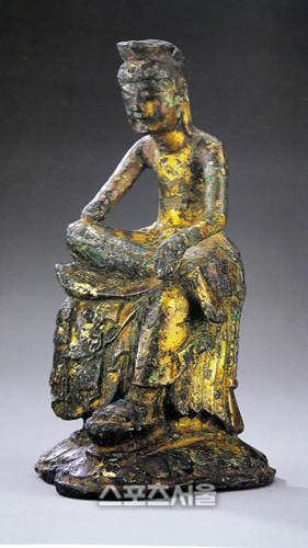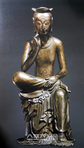 [스포츠서울 왕진오기자] 의자에 앉아 왼발은 내리고, 오른발은 왼쪽 다리 위에 걸쳤으며, 오른쪽 팔꿈치를 무릎 위에 올려놓고 손가락을 뺨에 댄 채 명상에 잠긴 반가사유의 자세를 취하고 있다.