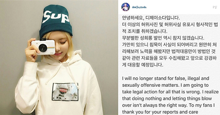 DJ 소다는 지난 14일 자신의 인스타그램을 통해 "더이상의 허위사진과 허위사실 유포 시 형사적인 법적 조치를 취하겠다"며 "무분별한 성희롱 발언 역시 참지 않겠다"고 밝혔다.