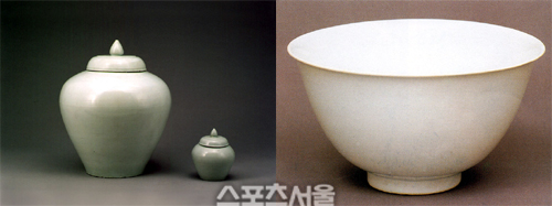 ▲국보 제261호 '백자 유개항아리'(왼쪽)와 국보 제286호 '백자 천지현황명발'.(사진=문화재청)