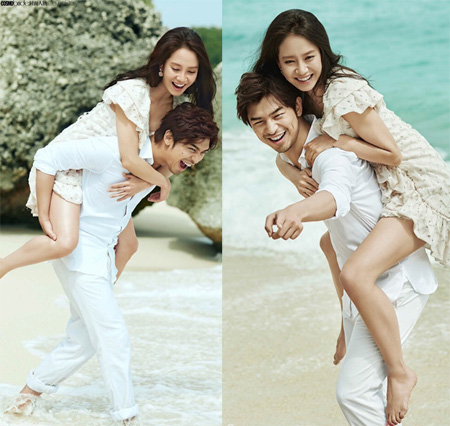 발리에서 촬영된 웨딩 화보에서 송지효는 진백림과 화이트 의상을 맞춰 입고 실제 연인 같은 호흡을 자랑했다. 특히 송지효는 아름다운 바다와 모래사장을 배경으로 진백림의 등에 업혀 행복한 미소를 짓고 있어 눈길을 끈다.