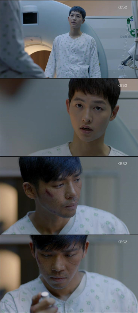 7일 방송된 KBS2 수목드라마 '태양의 후예'에서는 강모연(송혜교 분)의 도움 덕분에 유시진(송중기 분)과 안정준(지승현 분) 상위과 CT실에서 대화를 나눈 장면이 그려졌다.