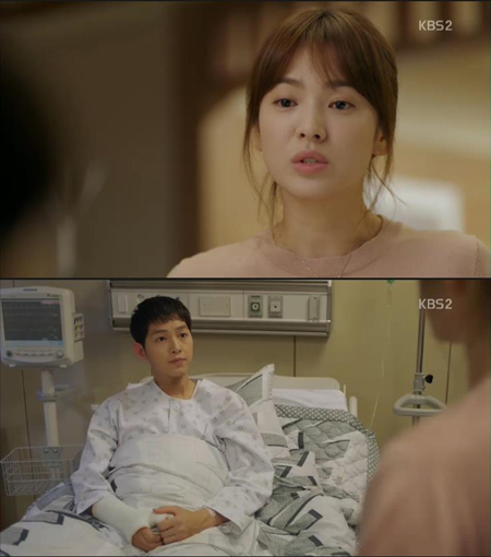 7일 방송된 KBS2 수목드라마 '태양의 후예'에서는 유시진(송중기 분)과 강모연(송혜교 분)이 대화를 나누는 모습이 그려졌다.