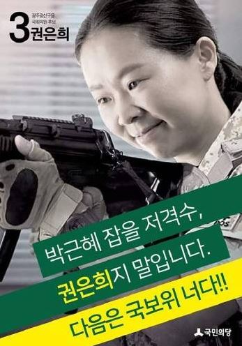 한편, 권은희 후보는 앞서 박근혜 대통령과 더민주 김종인 비상대책위 대표를 겨냥한 ‘저격 포스터’로 구설에 오른 바 있다. 이와 관련해 자유청년연합은 11일 허위사실 유표로 인한 공직선거법 위반 및 형법 311조 국가원수 모욕죄 위반으로 권 후보를 검찰에 고발했다.