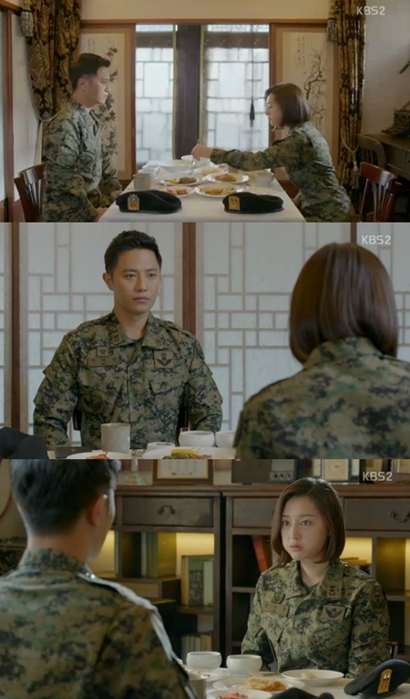 13일 오후 방송된 KBS2 수목드라마 '태양의 후예'에서는 서대영(진구 분)과 윤명주(김지원 분)이 함께 식사했다