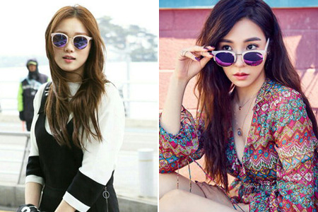 이성경이 공항에서 착용한 선글라스와 티파니가 화보에서 착용한 선글라스는 봄내음이 물씬 풍기는 파스텔 톤의 핑크와 여성미가 강조된 라운드 모양의 하금테가 러블리한 느낌을 자아낸다.