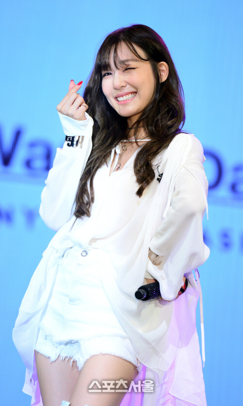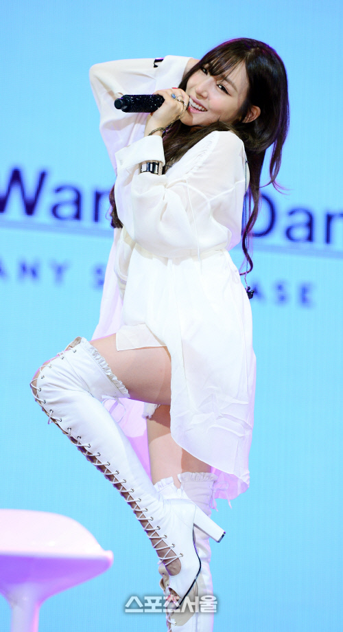 이날 쇼케이스에 참석한 티파니가 사회자의 요청에 따라 포즈를 취하고 있다.
