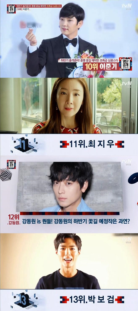10위는 이준기로, 그는 할리우드 진출에 앞서 하반기 안방극장부터 접수할 예상된다고. 이준기는 SBS 월화드라마 '달의 연인-보보경심:려'에 출연해 하반기 꽃길을 걸을 기대주가 되고 있다. 11위 최지우는 올 하반기 방송 될 예정인 MBC 법정로맨스 '캐리어를 끄는 여자'를 통해 연기 변신을 선보일 예정이라고.