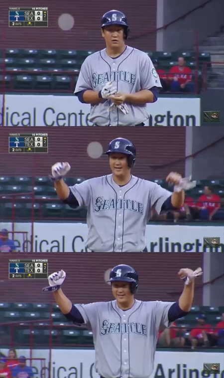 이대호는 첫 타석부터 텍사스 선발 콜 해멀스를 상대로 좌익선상에 떨어지는 2루타를 때려냈다. 이는 빅리그 복귀 첫 안타였다.