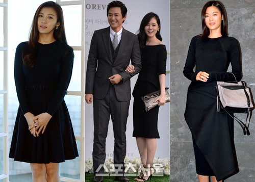 ▶배우 하지원은 검은 원피스와 진하지 않은 레드립으로 차분한 룩을 연출했다. 여기에 큼직한 귀걸이와 반지를 매치해 포인트를 살렸다.