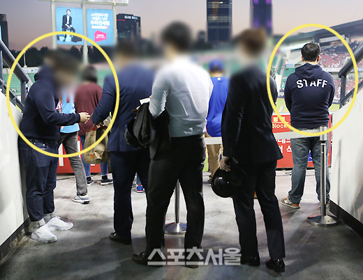 분명한 건, 그동안 볼 수 없었던 '뚜렷한' 변화가 있었다. 기자의 경험상 3루 응원단상 바로 옆 출입구에는 통상 한 명의 진행요원(왼쪽)이 배치돼 사진과 같이 입장 관중들의 티켓을 확인한다. 하지만 이날은 달랐다. 왼쪽과 오른쪽 두 명의 진행요원(스테프)이 배치됐다.
