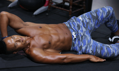 ② 어깨만 바닥에서 뗀 상태로 올라온 뒤 호흡을 뱉는다.