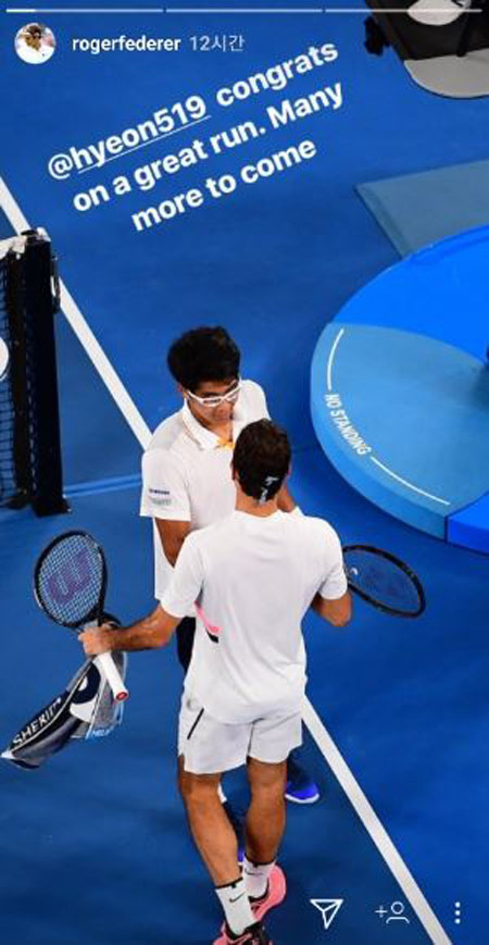 페더러는 정현과 악수하는 사진과 함께 "위대한 여정에 축하를 보낸다. 앞으로 더욱 많은 기회가 있을 거다"라는 글을 게재했다.