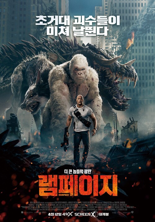 '램페이지'는 1980년대 동명의 오락실용 전자 게임을 모티브로 기획된 영화로, 주인공의 친구인 고릴라를 비롯해 숲에 살던 동물 세 마리가 유전자 실험 부작용으로 변이를 일으켜 초거대 괴수로 돌변하고, 미국 전역을 파괴한다는 내용을 담았다. '분노의 질주'와 '쥬만지 2'로 많은 사랑을 받은 드웨인 존슨이 '데이비스'로 분했다.