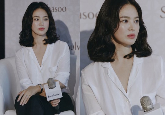 이날 또 다른 사진 속 뷰티 행사장에 등장한 송혜교는 흰색 블라우스와 블랙 슬랙스를 입고 군더더기 없이 깔끔한 스타일로 본연의 아름다움을 자랑했다.