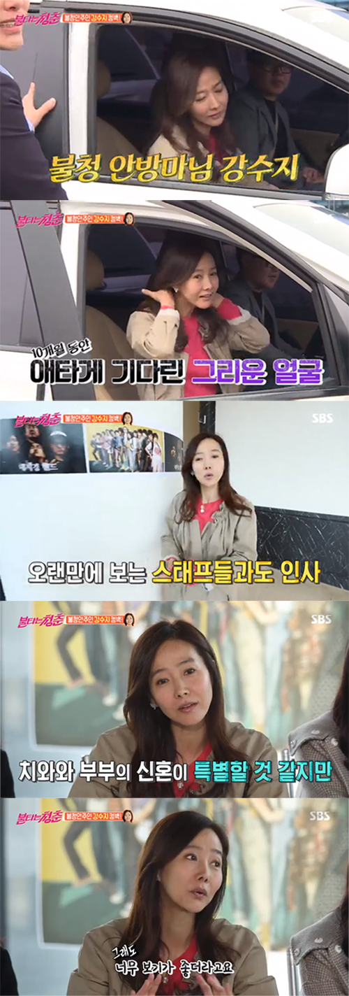 최성국은 "국진이 형과 '불타는 청춘' 방송을 본 적 있냐"고 물었다. 이에 강수지는 "다 보고 있다"면서 "아주 편하게 보고 있다"고 웃었다. "방송을 보면서 둘이 무슨 생각이 들었냐"는 질문에는 "'우리 없어도 아주 잘 노네'라고 생각했다"고 미소를 지었다. 강수지는 "농담이었다"면서 "우리가 없어도 너무 재밌고 보기가 좋더라. 그리웠다"고 덧붙였다.
