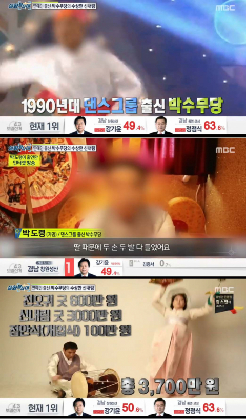 3일 방송된 MBC 예능 프로그램 '실화탐사대'에서는 연예인 출신의 박수무당 박도령(가명)의 수상한 신내림에 대한 내용이 전파를 탔다.