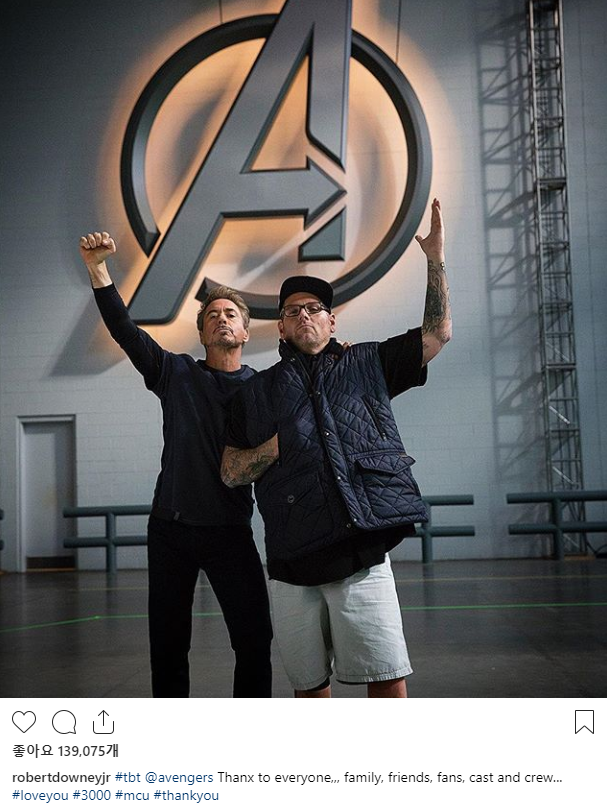 사진 속 그는 절친한 친구이자 매니저 지미 리치와 함께 '어벤져스: 엔드게임'의 세트장에서 포즈를 취하고 있다.