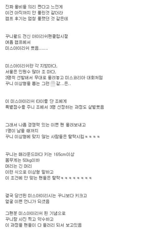 이 과정을 통해 미스 아이리쉬로 뽑힌 여성 팬에게는 강성훈과 사진 촬영, 악수 기회가 제공된 것으로 알려졌다. A 씨는 "팬들을 들러리가 돼 이 과정을 모두 보고 있었다"며 "이런 기획을 누가 했는지 지금 생각해도 이상하다"고 덧붙였다.