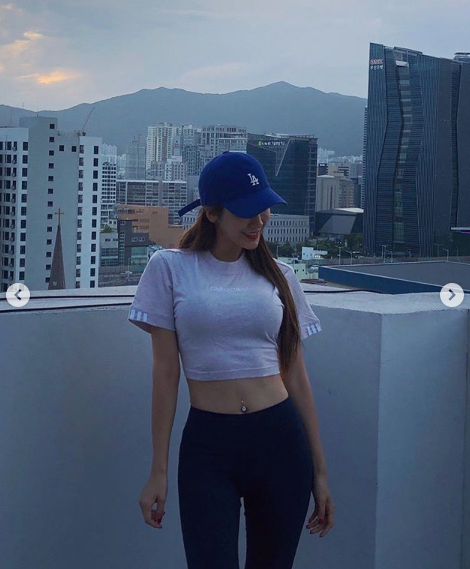 공개된 사진 속 그는 크롭톱에 네이비 레깅스를 입고 포즈를 취하고 있다. 군살 하나 없는 완벽한 몸매가 눈길을 사로잡는다.