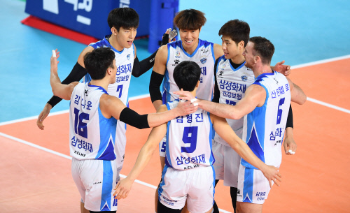 [스포츠서울 정다워기자]외국인 선수 안드레아 산탄젤로가 맹활약한 가운데 삼성화재가 KB손해보험을 잡고 순위 도약에 성공했다.