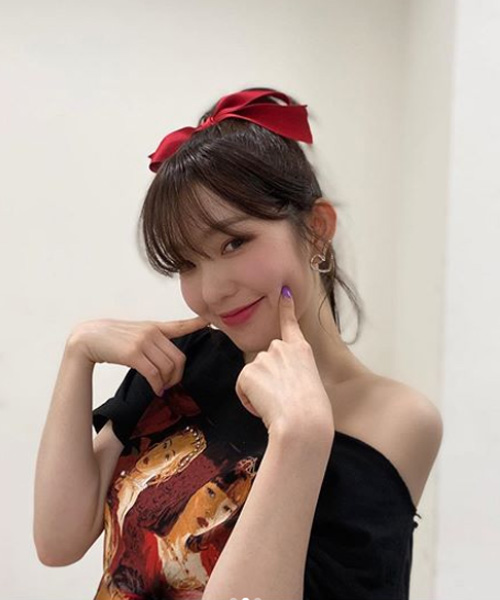 한쪽 어깨가 드러나는 검은 티셔츠를 입고, 빨간 리본으로 머리를 묶어 귀여움을 더했다.