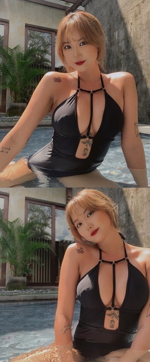사진 속 LE는 블랙 모노키니 차림으로 수영장에 앉아 포즈를 취하고 있다. 몸매가 고스란히 드러나는 파격적인 커팅의 수영복으로 섹시한 매력을 극대화했다. 복부와 어깨, 양팔의 타투가 시선을 사로잡는다.