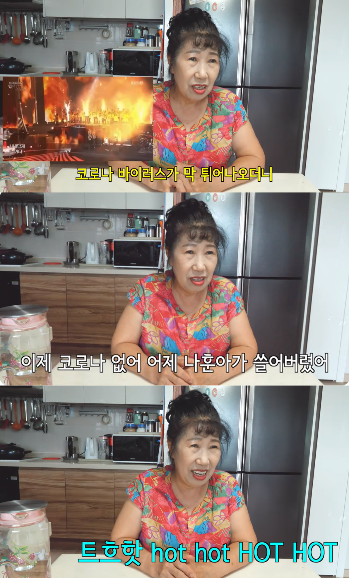 박 할머니는 "진짜 대단해. 나훈아가 혼자 코로나를 불태워버렸어. 다 쓸어부렀어. 불을 질러갖꼬"라고 말했다.