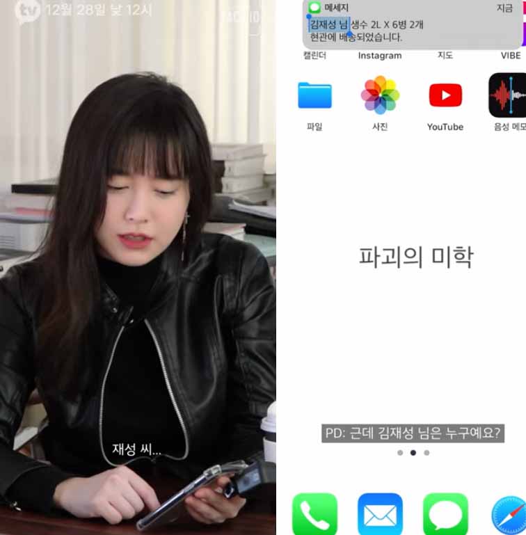 하얀 바탕에 '파괴의 미학'이라는 글이 적힌 심플한 배경화면에 여러가지 애플리케이션이 보이는 가운데, '김재성님, '생수 O리터, 현관에 배송되었습니다'라는 문자메시지가 떠 궁금증을 안겼다.
