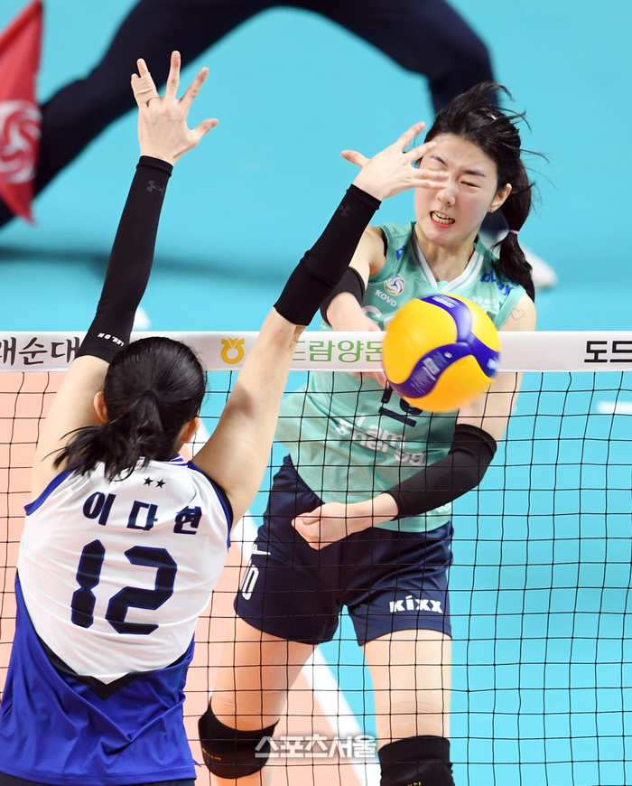 GS칼텍스 강소휘(오른쪽)가 3일 장충체육관에서 열린 2023-2024 V리그 여자부 현대건설과 경기에서 현대건설 이다현의 블로킹을 피해 스파이크 공격을 하고 있다. 2023. 11. 3. 장충 | 박진업기자 upandup@sportsseoul.com