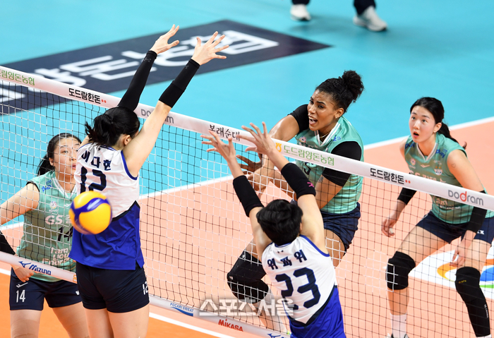 GS칼텍스 실바(오른쪽)가 3일 장충체육관에서 열린 2023-2024 V리그 여자부 현대건설과 경기에서 스파이크 공격을 하고 있다. 2023. 11. 3. 장충 | 박진업기자 upandup@sportsseoul.com
