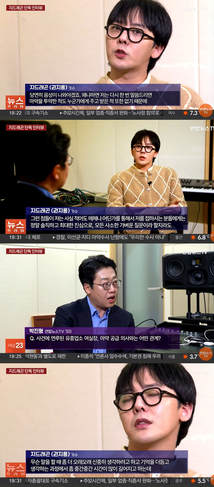 지드래곤은 13일 오후 연합뉴스TV ‘뉴스 프라임’ 박진영 앵커와 인터뷰를 가졌다. 지난달 25일 인천경찰청이 마약류 관리에 관한 법률 위반 혐의로 지드래곤을 불구속 입건한 사실이 알려진지 20여일 만이다.