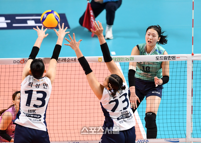 GS칼텍스 권민지(오른쪽)가 29일 장충체육관에서 열린 2023-2024 V리그 여자부 IBK기업은행과 경기에서 스파이크 공격을 하고 있다. 2023. 11. 29. 박진업기자 upandup@sportsseoul.com