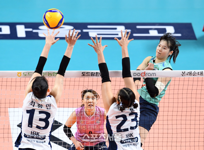 GS칼텍스 유서연(오른쪽 위)가 29일 장충체육관에서 열린 2023-2024 V리그 여자부 IBK기업은행과 경기에서 스파이크 공격을 하고 있다. 2023. 11. 29. 박진업기자 upandup@sportsseoul.com
