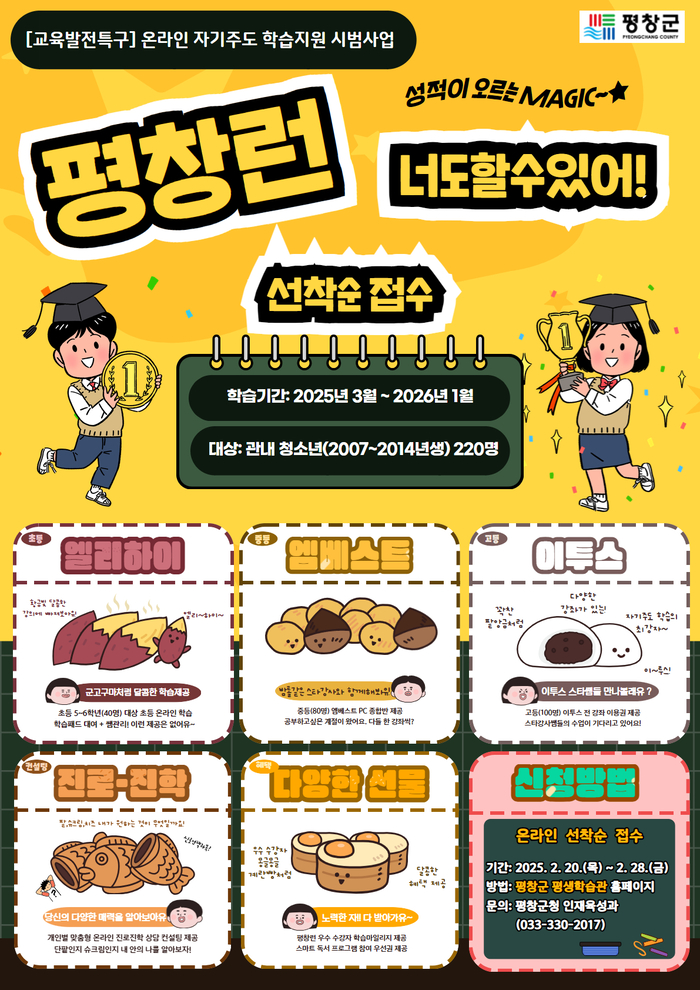 [스포츠서울ㅣ김기원기자]평창군(군수 심재국)은 서울시의 우수 교육정책인 공공 학습플랫폼 서울런을 연계한 평창런 참여자를 20일부터 28일까지 선착순 모집하고 3월부터 시범으로 운영한다.
