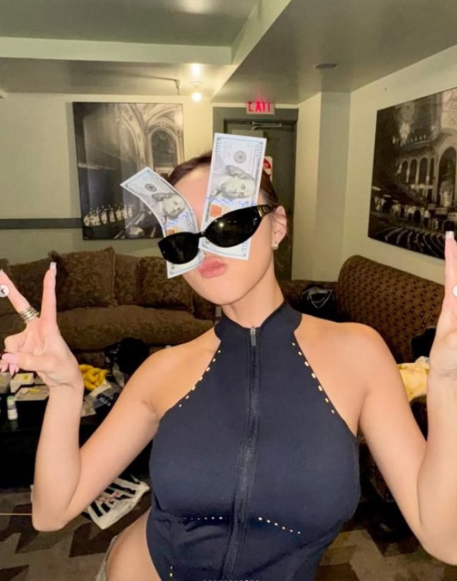 얼굴에는 100달러 지폐를 이용해 익살스러운 포즈를 취하며 그녀만의 유쾌한 매력을 발산했다. 배경에는 투어 준비로 분주한 대기실이 보이며, 화사의 열정적인 활동이 엿보인다.