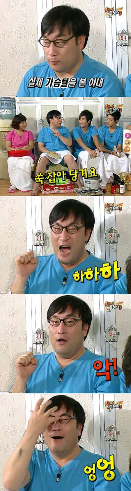 이어 이혁재는 "너무나도 아파서 비명을 질렀고, "뭐 하는 거야?"라고 따져 묻자, 아내가 진짜 털이었냐고 묻지도 않고 그냥 '하하하' 웃다가 많이 놀랐는지 바로 눈물을 터뜨렸다"고 말해 좌중을 폭소케 했다.