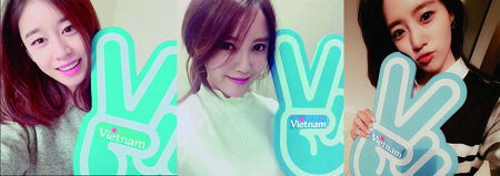 공개된 사진 속에서 3명은 베트남이 새겨진 네이버 V앱 판넬을 각각 들고 카메라를 향해 환한 미소를 지어 보이며 깜찍한 셀카를 공개했다.