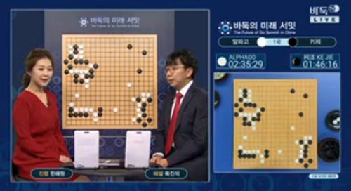 23일 오전 10시 30분(현지시간) 중국 저장성 우전 국제인터넷컨벤션센터에서 열린 '바둑의 미래 서밋(Future of Go Summit)' 3번기 1국에서 커제 9단은 구글 자회사 딥마인드가 개발한 알파고에 289수 만에 흑 1집 반패했다.